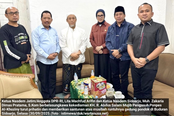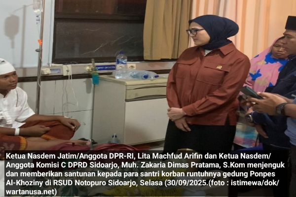 Ketua Partai Nasdem (Nasional Demokrat) Jawa Timur, Lita Machfud Arifin didampingi Ketua DPD Partai NasDem Sidoarjo, Muh Zakaria Dimas Pratama,S.Kom peduli sosial dengan mengunjungi langsung lokasi Gedung 3 Lantai Pondok Pesantren (Ponpes) Al-Khoziny yang runtuh, Selasa (30/09/2025). Anggota Komisi X Bidang Pendidikan, Olahraga dan Riset DPR-RI Dapil Jatim I Sidoarjo-Surabaya dan Anggota Komisi C DPRD Sidoarjo memberikan santunan langsung kepada Pengasuh Ponpes, KH. R. Abdus Salam Mujib dan keluarga santri korban yang dirawat di RSUD Notopuro Sidoarjo.