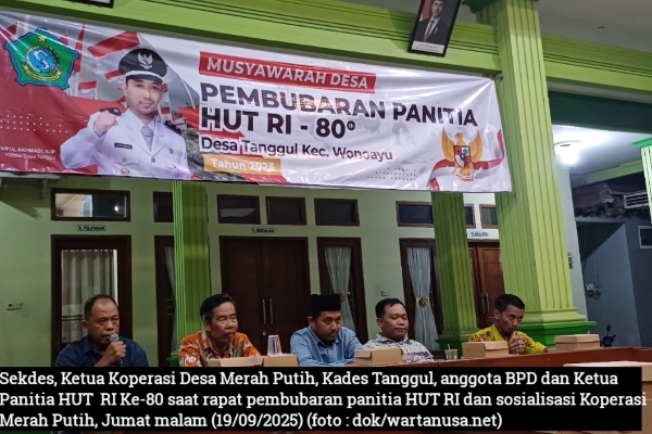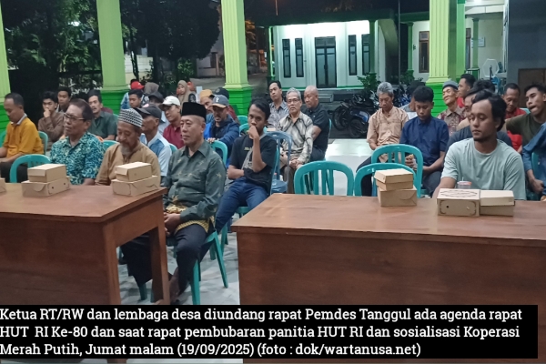 Sidoarjo – wartanusa.net. Pemerintah Desa (Pemdes) Tanggul menggelar rapat musyawarah dengan dua agenda, Jumat malam (19/09/2025), di kantor balai desa setempat. Rapat pertama, pembubaran Panitia HUT RI ke-80. Rapat kedua, musyawarah tentang sosialisasi tindak lanjut pasca pembentukan Koperasi Desa Merah Putih.
